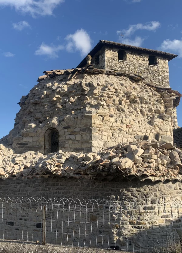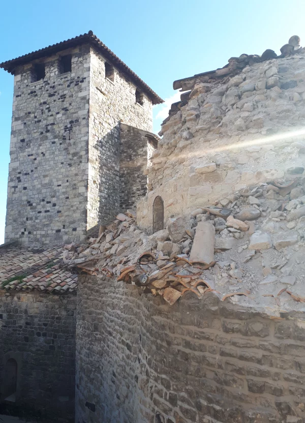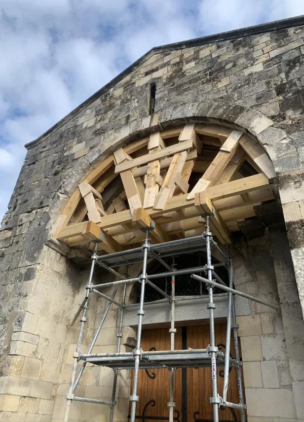 Après ces mesures d’urgence, a suivie l’installation des premiers organes de stabilité : bâchage du baptistère effondré, étaiement du portail d’entrée, cerclage du clocher et évacuation du mobilier protégé.