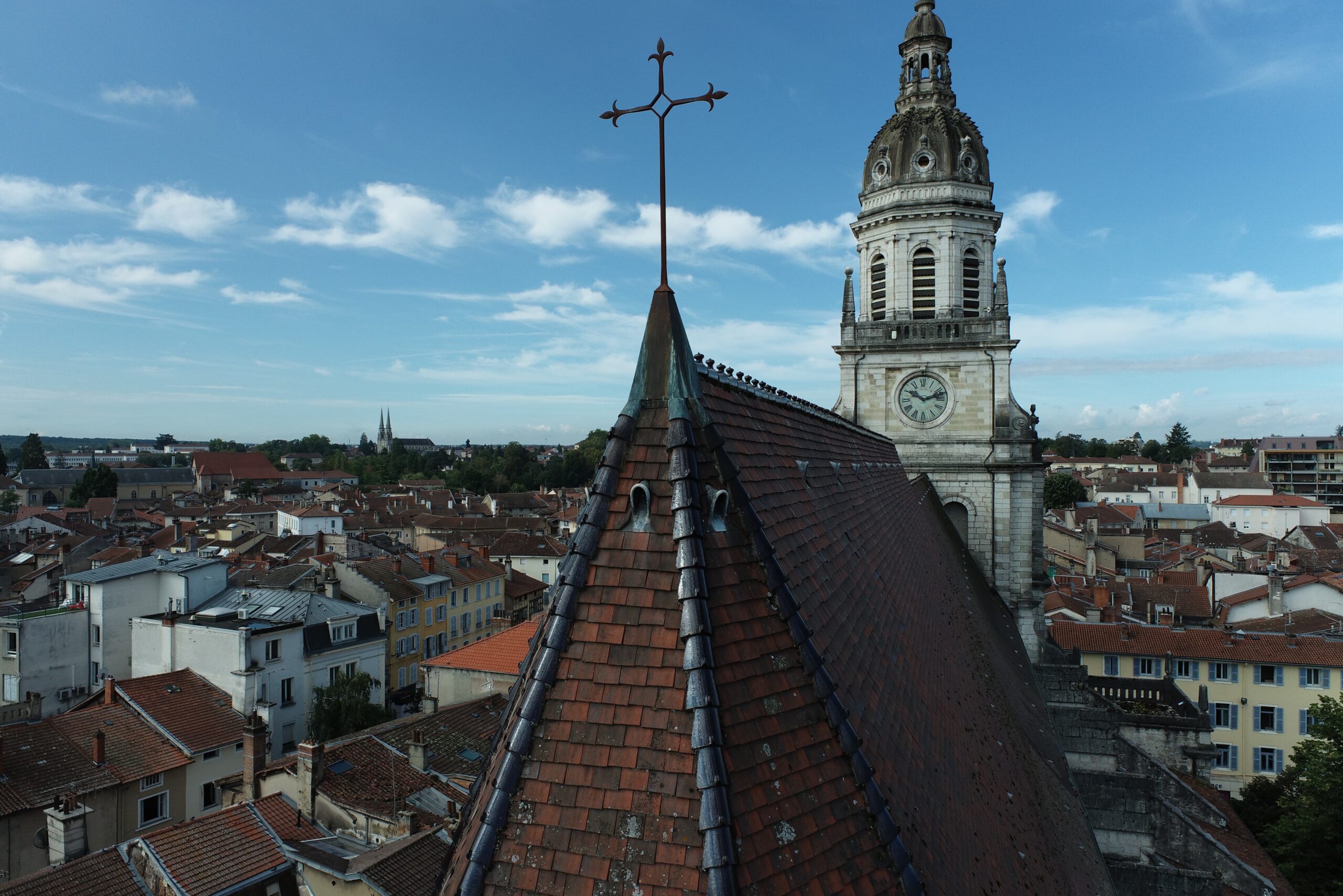 La co-cathédrale de Bourg-en-Bresse est située au centre du bourg, à l’origine intramuros, contre le rempart défensif de la ville, dans un tissu urbain médiéval dense où subsistent encore des vestiges de maisons à colombages. La vieille ville s’est principalement développée au sud-ouest de l’édifice. Légèrement désorientée en raison de son implantation urbaine, la co-cathédrale se distingue par son architecture imposante. Elle est composée d’une grande nef de 64 mètres de long, structurée en sept travées avec bas-côtés et chapelles latérales. Le chœur, constitué d’une travée droite barlongue et d’une abside pentagonale, reflète une conception architecturale soignée. La hauteur de son clocher, culminant à 70 mètres, en fait un repère visible depuis la périphérie de la ville, attestant de l’importance symbolique et patrimoniale de l’édifice.